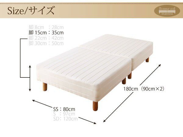 商品名セミシングルベッド 一人暮らし コンパクト ショート丈 SS 小さい ミニ 省スペース 脚付き マットレスベッド ボトムベッド 足付 ベンチ ソファー 短い 小さめ ヘッドレス ヘッドボードなし ローベッド ロータイプ フロア 低床 低い ルンバ 土台 北欧 おしゃれ モダン アンティーク商品バリエーションパッド・シーツは別売り セミシングル ショート丈 脚15cm全バリエーション商品説明搬入・組立・簡単 コンパクト 分割式脚付きマットレスベッド コイル【製品サイズ/重量】■脚8使用時セミシングル:幅80x長さ180x高さ28cm/24kgシングル:幅97x長さ180x高さ28cm/28kgセミダブル:幅120x長さ180x高さ28cm/32kg床下スペース:8cm■脚15cm使用時セミシングル:幅80x長さ180x高さ35cm/25kgシングル:幅97x長さ180x高さ35cm/29kgセミダブル:幅120x長さ180x高さ35cm/33kg床下スペース:15cm■脚22使用時セミシングル:幅80x長さ180x高さ42cm/26kgシングル:幅97x長さ180x高さ42cm/30kgセミダブル:幅120x長さ180x高さ42cm/34kg床下スペース:22cm■脚30使用時セミシングル:幅80x長さ180x高さ50cm/27kgシングル:幅97x長さ180x高さ50cm/31kgセミダブル:幅120x長さ180x高さ50cm/35kg床下スペース:30cmマットレス厚み:20cm脚の太さ:直径6cm【ベッド材質】木脚、天然木、2.2mmコイルスプリング(コイル数/セミシングル:210、シングル:240、セミダブル:330)、ウレタンフォーム、防音フォーム、フェルト、不織布、ポリエステル100%張り地【生産国】中国【梱包サイズ/重量】脚8使用時セミシングル:幅81x長さ91x高さ40.5cm/24kg、幅38x長さ14x高さ8cm/2kgシングル:幅98x長さ91x高さ40.5cm/28kg、幅38x長さ14x高さ8cm/2kgセミダブル:幅121x長さ91x高さ40.5cm/32kg、幅38x長さ14x高さ8cm/2kg脚15使用時セミシングル:幅81x長さ91x高さ40.5cm/24kg、幅70x長さ14x高さ8cm/3kgシングル:幅98x長さ91x高さ40.5cm/28kg、幅70x長さ14x高さ8cm/3kgセミダブル:幅121x長さ91x高さ40.5cm/32kg、幅70x長さ14x高さ8cm/3kg脚22使用時セミシングル:幅81x長さ91x高さ40.5cm/24kg、幅93x長さ14x高さ8cm/4kgシングル:幅98x長さ91x高さ40.5cm/28kg、幅93x長さ14x高さ8cm/4kgセミダブル:幅121x長さ91x高さ40.5cm/32kg、幅93x長さ14x高さ8cm/4kg脚30使用時セミシングル:幅81x長さ91x高さ40.5cm/24kg、幅96x長さ20x高さ8cm/5kgシングル:幅98x長さ91x高さ40.5cm/28kg、幅96x長さ20x高さ8cm/5kgセミダブル:幅121x長さ91x高さ40.5cm/32kg、幅96x長さ20x高さ8cm/5kg※各サイズ/重量は概算になります。