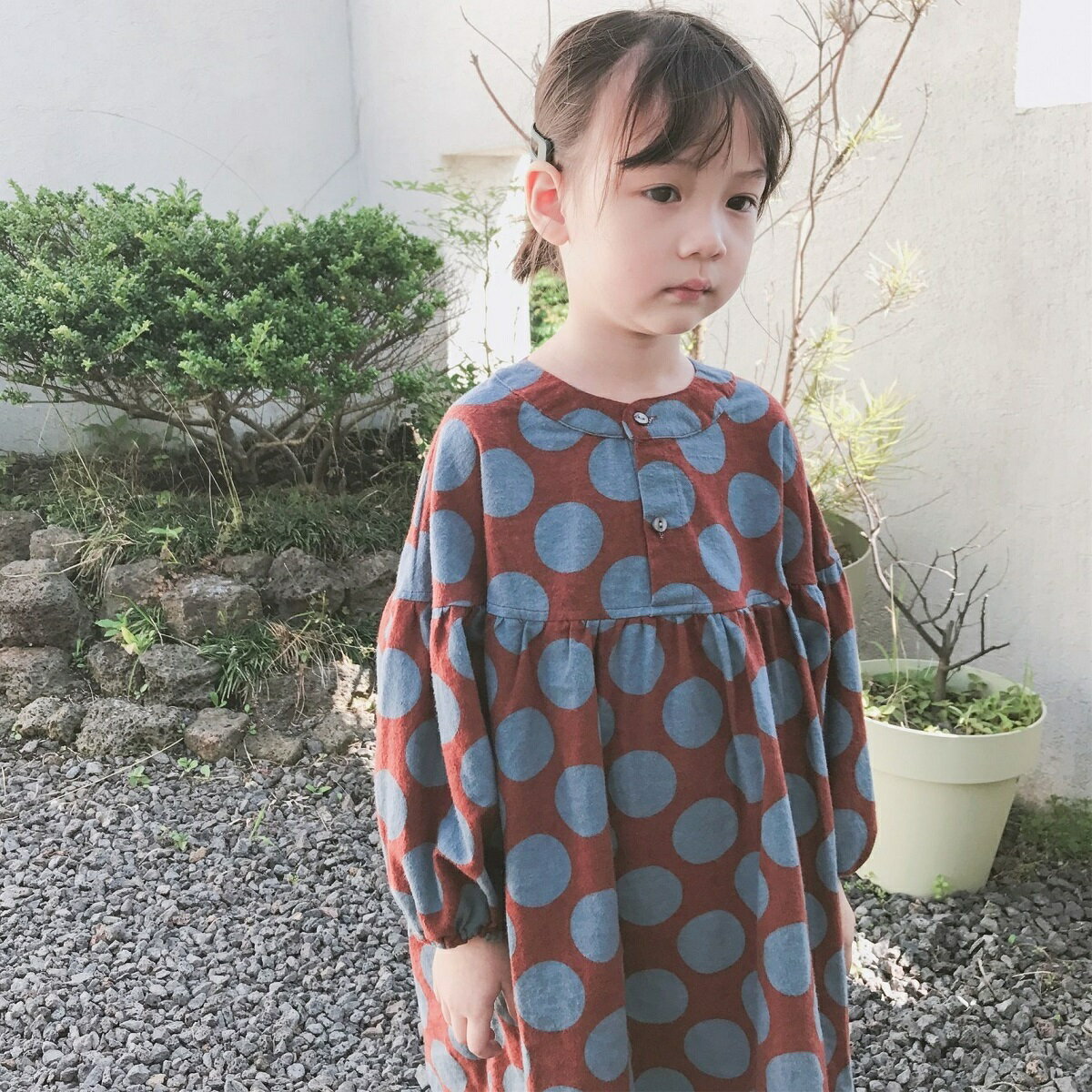 送料無料 ワンピース 7分袖 ヘンリーネック 膝丈 ミディアム丈 ミディ丈 ドット柄 子供用 キッズ フレアスカート ウィンドカフス 水玉模様 おしゃれ 可愛い かわいい ガーリー 女の子 女児 子供服 子ども服 こども服