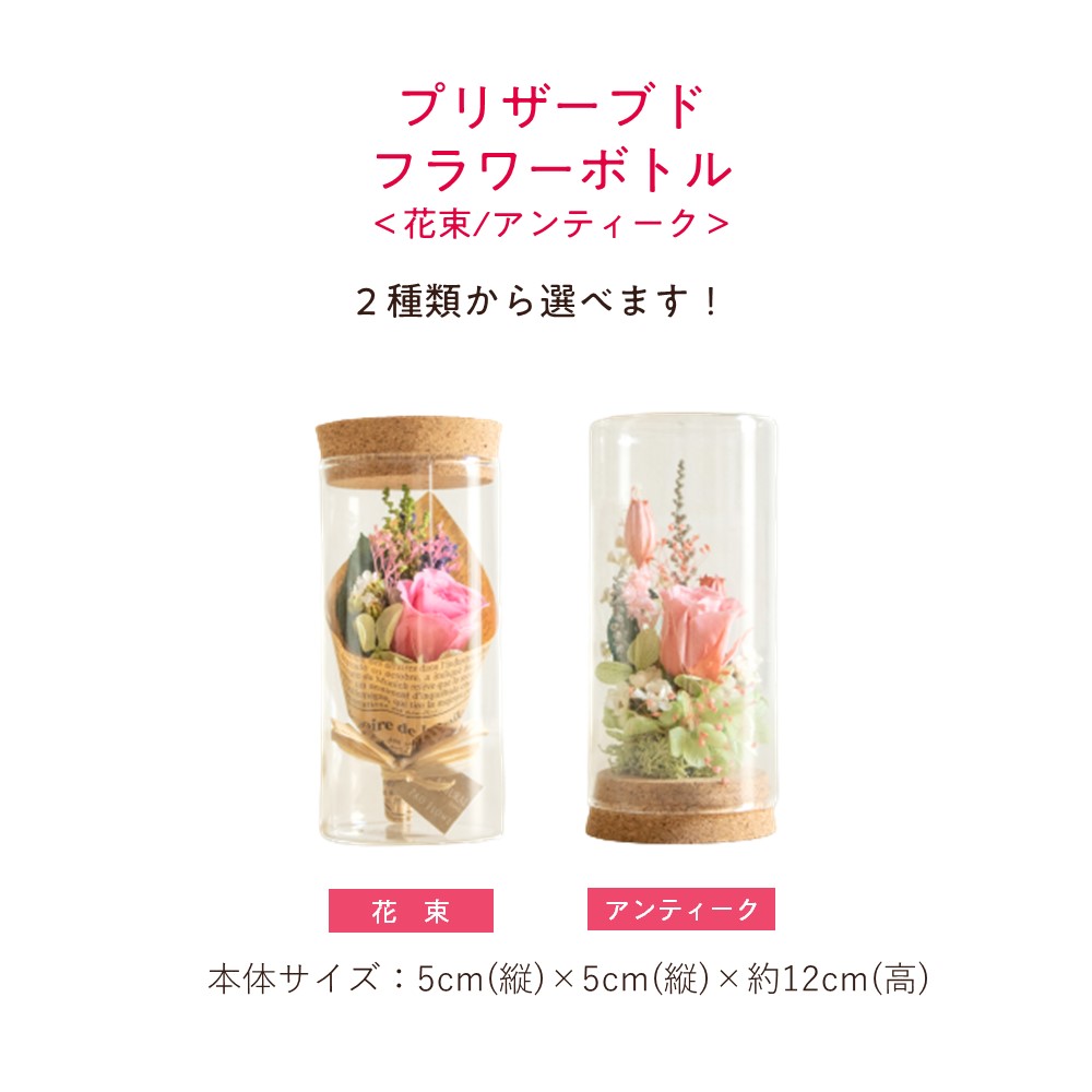 フラワーボトル(花束・アンティーク) [材料]ガラスドーム、台座コルク、ドライフラワー、プリザーブドフラワー等 本品サイズ:5.0cm(D)×5.0cm(W)×12cm(H) ※ケースサイズ:6.5cm(D)×6.5cm(W)×13cm(H) ※自然素材を利用した商品となりますので、色や形、見た目などが画像と異なる場合があります。