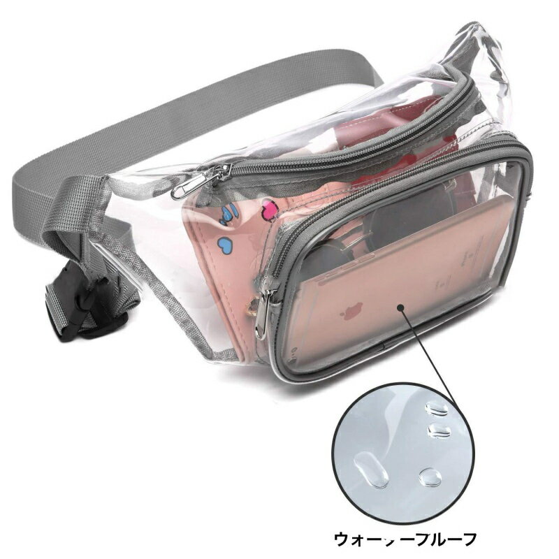 送料無料 ウエストバッグ ウエストポーチ クリアバッグ ビーチバッグ プールバッグ スケルトン 透明 中が見える ダブルポケット 防水 ウォータープルーフ ファスナー 男女兼用 ユニセックス かばん 鞄 ヒップバッグ ボディバッグ バックル 長さ調節可能