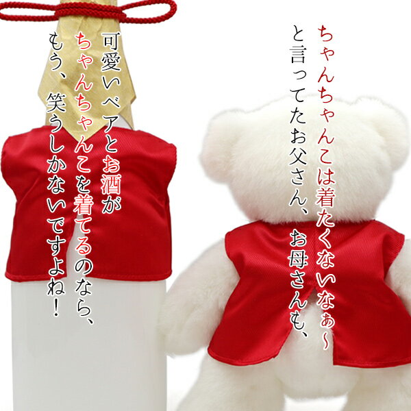 なので、お祝いのお酒とテディベアに赤いちゃんちゃんこを着せてみました! これなら、一石二鳥と言うか、大好きなお酒がちゃんちゃんこを着ているので、ちゃんちゃんこを着るのを嫌がっていたお父さんやお母さんも、笑うしかないですよね♪