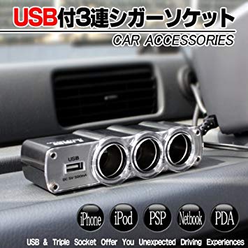 USBポート搭載 3連シガーソケット 商 品 説 明 3連シガーソケットとUSBポートを搭載!! 簡単に設置ができるから便利!! ソケットが3個と USBポートが搭載されており もう電源で困ることがございません!! 車のシガーソケットに挿すだけで車の可能性が無限大に!! カーナビ・FMトランスミッターなど3連あれば差し込み放題!! コードの長さも約50cmと長い為、設置の場所に困る心配もございません!! 【注意事項】USBポートは500mAとなっております。