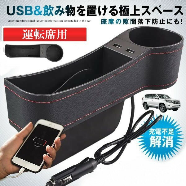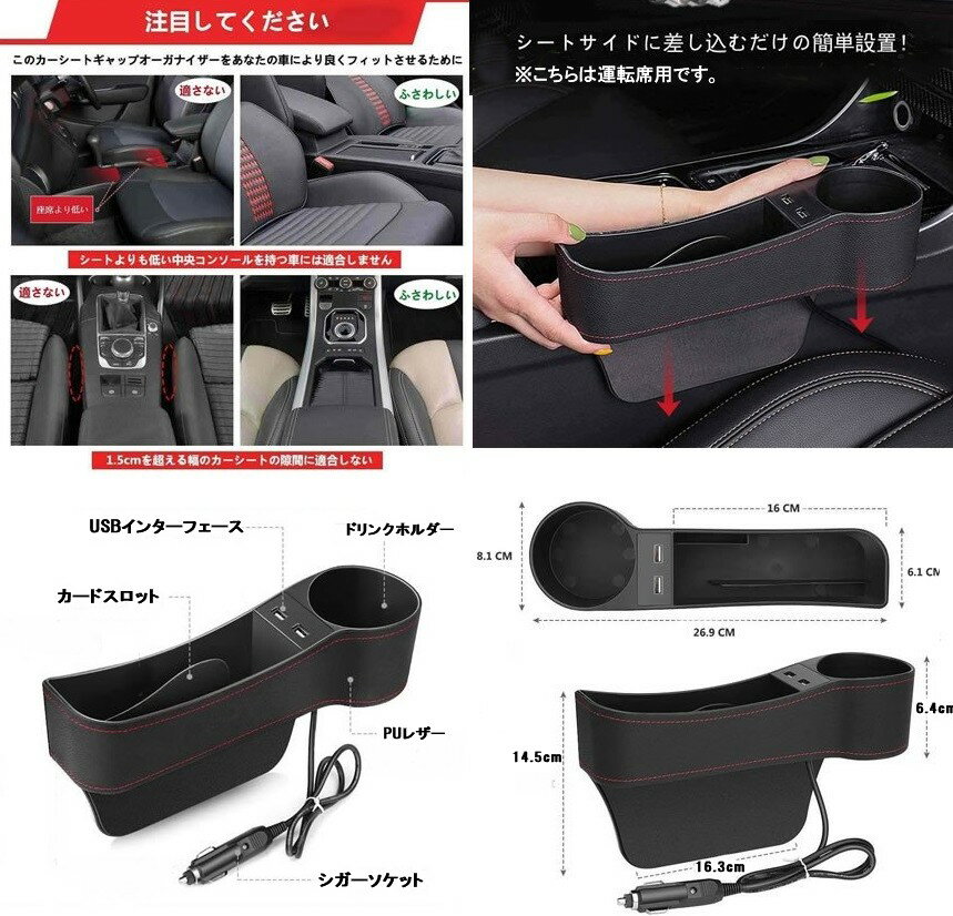 運転中の急ブレーキでも、座席の隙間落下防止! シート周りをきれいにでき、気分良くドライブを楽しめ ます 【2USBポート搭載】 USBポートを2つ搭載しており 別途充電ケーブルを利用して2台の機器を充電可能。