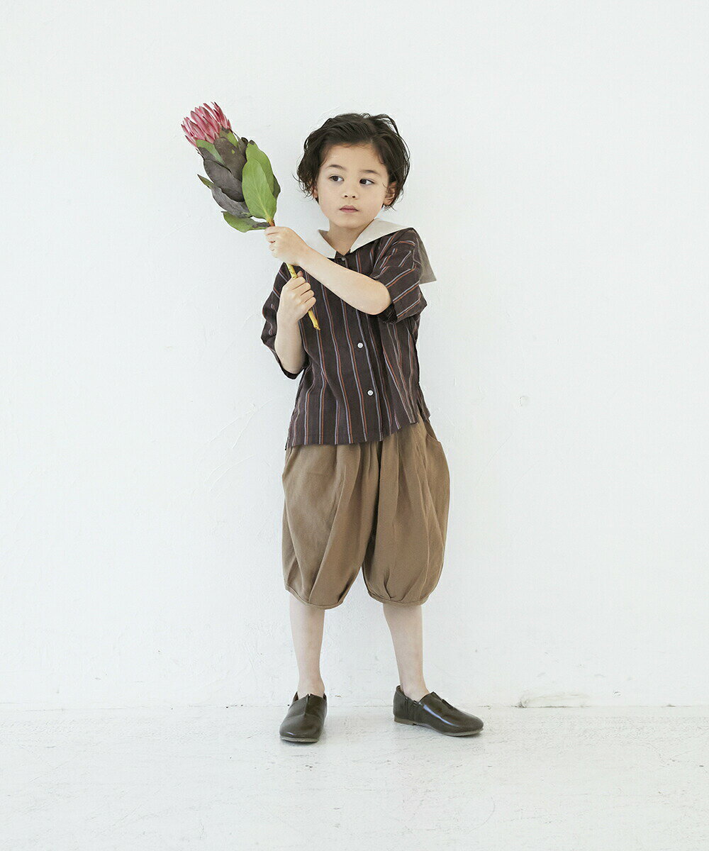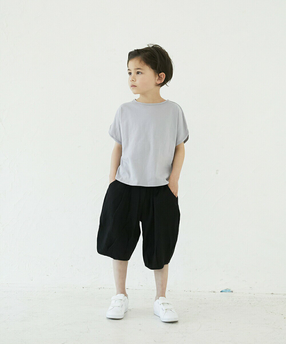 NATURAL MOCA BLACK 【モデル着画サイズ】 モデル 身長110.5cm着用サイズ 110cm着用(NATURAL着用) 裾を少し絞ることで、緩やかなバルーンシルエットに♪