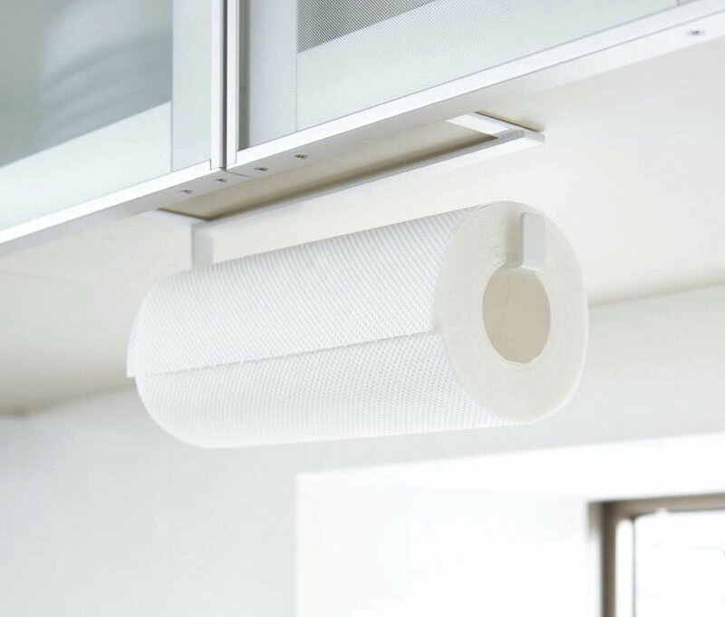 吊り下げ戸棚に差し込んで使えば、空いた空間を有効活用でき、キッチン扉に使えば、手の届きやすい場所にキッチンペーパーやタオルをもってくることができます。