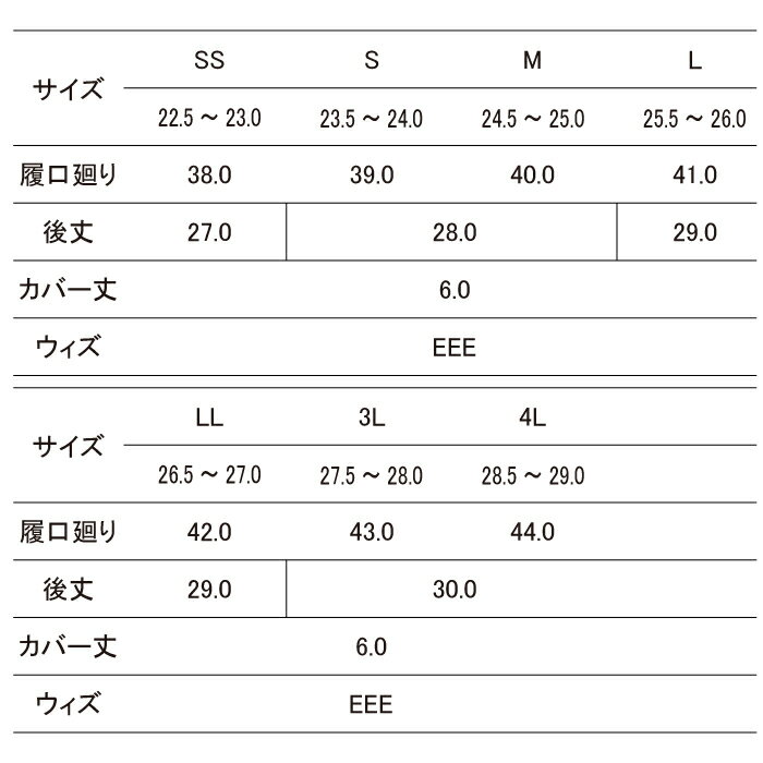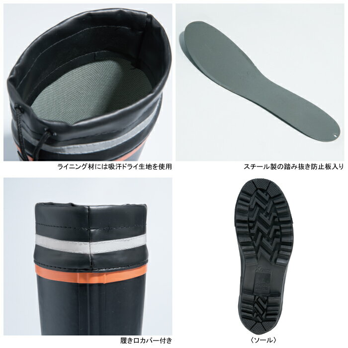 商品説明●オールシーズン用●男女兼用、吸汗裏布、踏み抜き防止板入り、製法:加硫製法、先芯:鋼製先芯、甲被:ラバー、インナー:吸汗ドライ生地、靴底:ラバー、重量(g/両足)1880g(L)●サイズ:SS(サイズ/22.5〜23.0、履口廻り/38.0、後丈/27.0、カバー丈/6.0、ウィズ/EEE)、S(サイズ/23.5〜24.0、履口廻り/39.0、後丈/28.0、カバー丈/6.0、ウィズ/EEE)、M(サイズ/24.5〜25.0、履口廻り/40.0、後丈/28.0、カバー丈/6.0、ウィズ/EEE)、L(サイズ/25.5〜26.0、履口廻り/41.0、後丈/29.0、カバー丈/6.0、ウィズ/EEE)、LL(サイズ/26.5〜27.0、履口廻り/42.0、後丈/29.0、カバー丈/6.0、ウィズ/EEE)、3L(サイズ/27.5〜28.0、履口廻り/43.0、後丈/30.0、カバー丈/6.0、ウィズ/EEE)、4L(サイズ/28.5〜29.0、履口廻り/44.0、後丈/30.0、カバー丈/6.0、ウィズ/EEE)商品仕様解体現場やゴミ処理場等、足元が危険な現場で活躍する踏み抜き防止長靴。